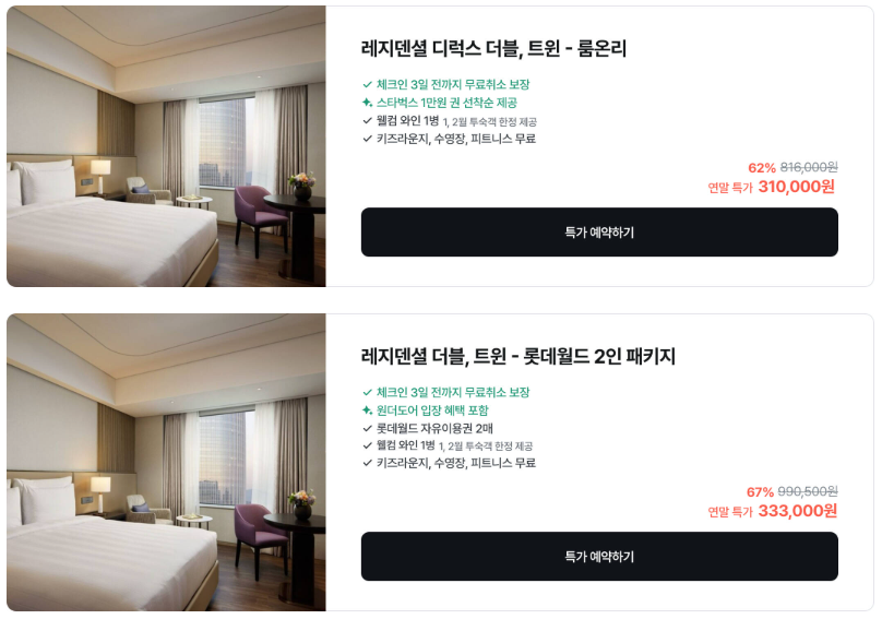 롯데호텔 월드에서 연말연시를 맞이하여 최대 67% 할인된 가격에 예약할 수 있도록 특가 행사를 진행합니다. 딱 이번 주 7일간만 예약이 가능하며 투숙 기간은 11월부터 2월까지로 넉넉하니 이번 포스팅에서 자세한 정보 확인하시고 합리적인 가격에 예약해 보세요! 룸온리부터 롯데월드 패키지까지 다양하니 가족, 친구, 연인 누구와도 행복한 연말연시를 보낼 기회이니 이번 프로모션 놓치지 마세요!!