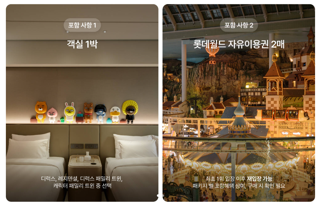 패키지 상품에는 객식 1박 투숙 외에도 롯데월드 자유이용권, 키즈라운지, 수영장, 피트니스, 원더도어 혜택까지 포함되빈다.