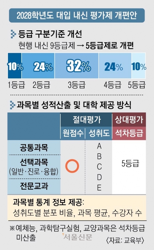 위에서도 언급한 것처럼 지금은 9등급제를 시행하고 있는데, 이를 전 학년 전 과목에 5등급제로 바꾸고 1등급 비율이 10%로 늘어납니다. 성적표에는 절대평가와 상대평가 등급을 함께 기재하게 됩니다. 이를 통해 내신 경쟁률이 너무 치열해지거나 변별력이 떨어지는 문제가 나오는 것을 방지하는 것을 교육부에서 기대한다고 하네요.